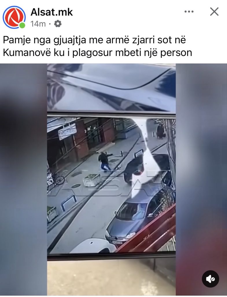 TV Alsat në rrjetet sociale ka publikuar pamje nga gjuajtja me armë zjarri që ndodhi sot para ndërtesës së Komunës së Kumanovës, ku u plagos funksionari i BDI-së dhe bartësi i listës së koalicionit AKI në Likovë, Dr. Zekirija Shaini, përcjell INA.